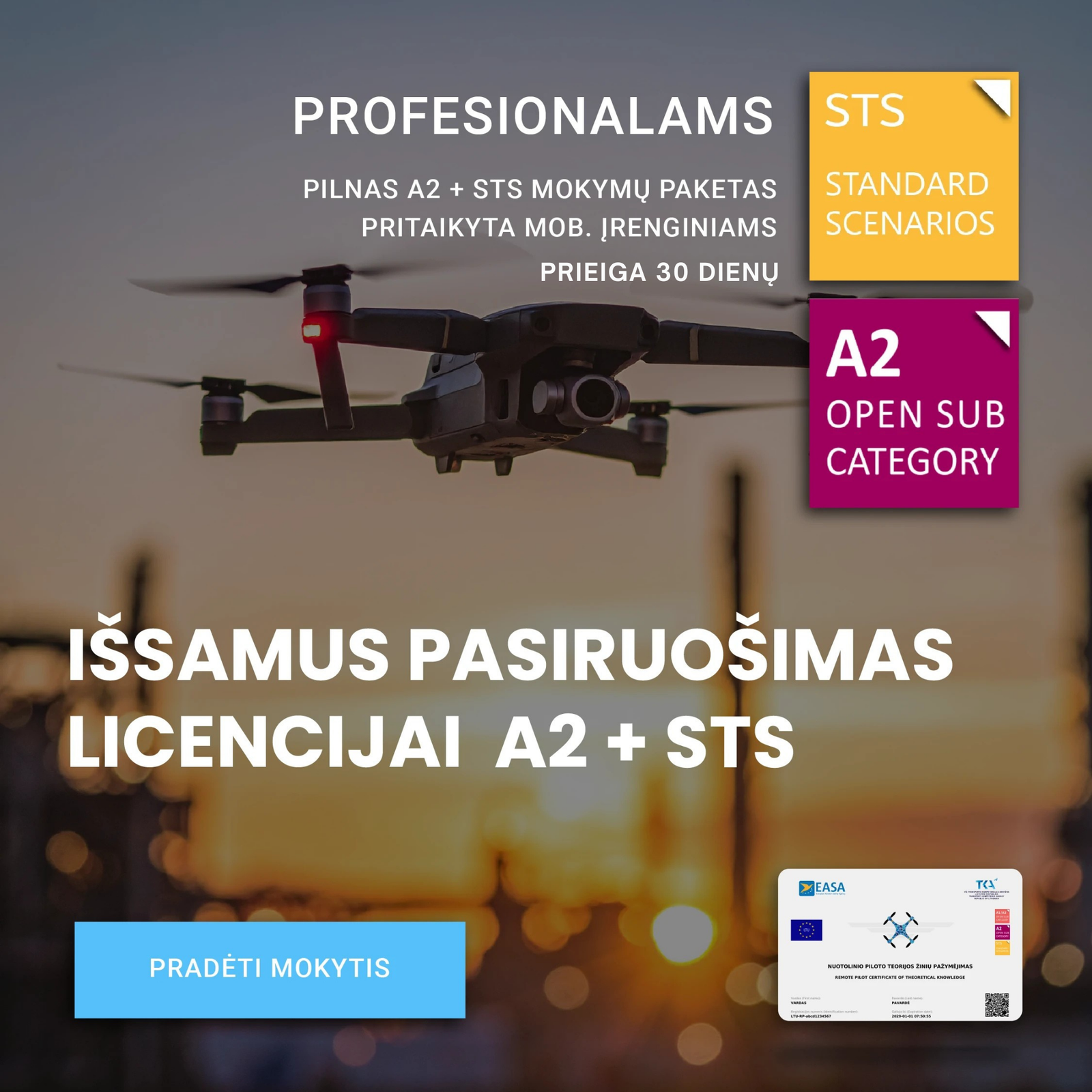 Mokymų paketas pažengusiems pilotams, norintiems skristi arčiau žmonių, infrastruktūros objektų ir vykdyti STS scenarijus. Apima A2 ir STS kursus su įskaitiniais testais. Prieiga suteikiama 30 dienų nuo įsigijimo.